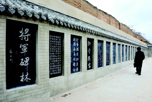 中岔古堡一堡三院,分為前院、中院、后院。走進(jìn)古堡,堡門左側(cè)建有戲樓,上書(shū)“中岔劇場(chǎng)”四字。戲樓(又稱戲臺(tái))始建于清光緒年間,上世紀(jì)六七十年代曾重修過(guò)。近堡門處右側(cè)堡墻下修建有兩處一體化的石碑長(zhǎng)廊一直通向后院,碑廊中石碑一塊接著一塊砌筑在青磚墻內(nèi),石碑與石碑之間以青磚分隔,上覆筒瓦和滴水防護(hù),每一通石碑上都刻有中華人民共和國(guó)將軍書(shū)寫(xiě)的一幅書(shū)法作品。第一通石碑上甘谷籍將軍張臣剛書(shū)寫(xiě)的“將軍碑林”四字分外醒目,劉精松、邢世忠、裴懷亮、李乾元等數(shù)十位叱咤風(fēng)云的共和國(guó)將軍書(shū)寫(xiě)的書(shū)法碑刻依次嵌進(jìn)墻內(nèi),組成一個(gè)氣勢(shì)磅礴、雄偉壯觀的將軍書(shū)法長(zhǎng)廊,這就是新建的將軍碑林。