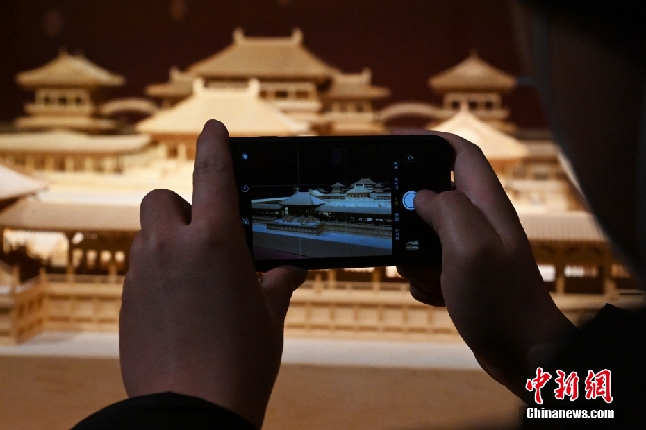 游客正在拍攝“千年?duì)I造——敦煌壁畫(huà)中的建筑之美”特展上的佛寺建筑群模型。