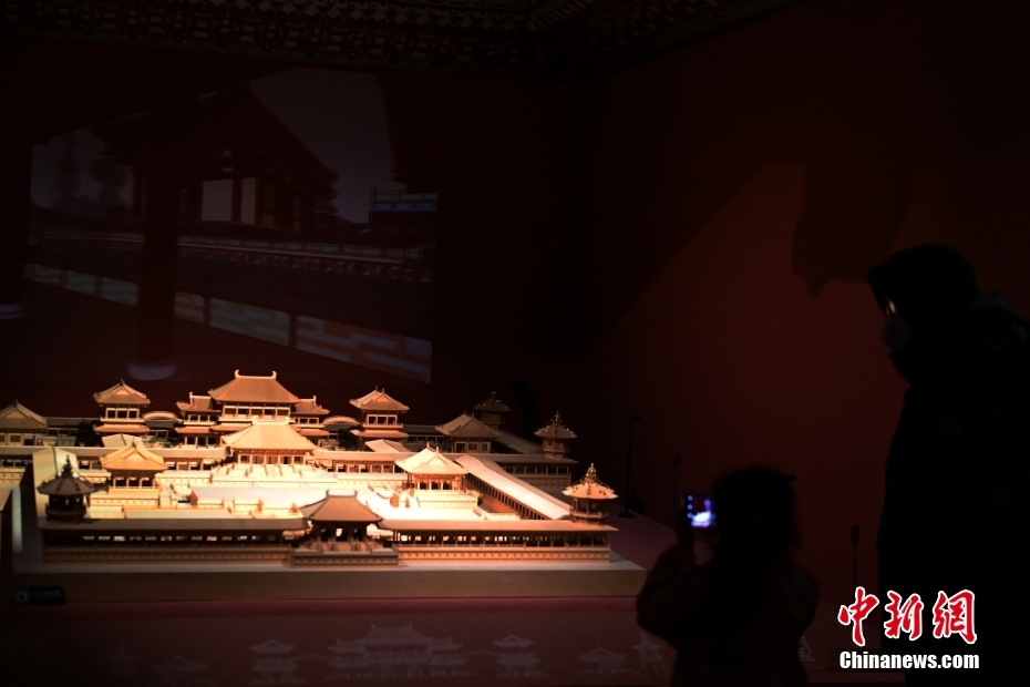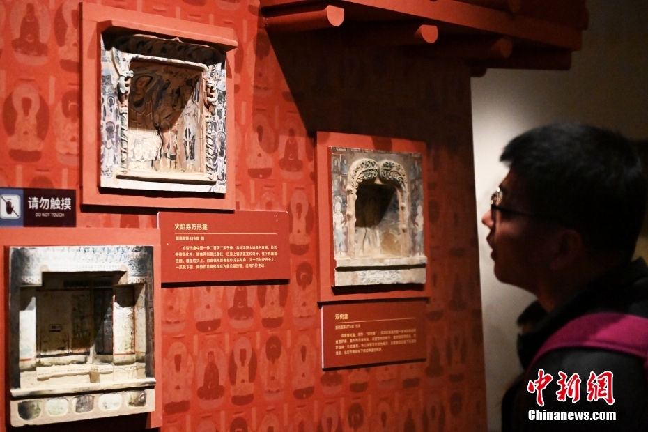 游客正在參觀“千年?duì)I造——敦煌壁畫(huà)中的建筑之美”特展上出自莫高窟第419窟的火焰券方形龕模型。(中新社記者 李亞龍 攝)