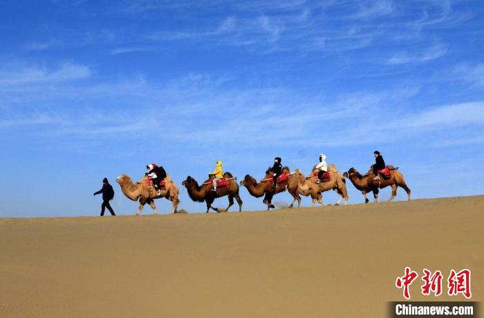 1月27日,游客騎駱駝暢游敦煌鳴沙山。張曉亮 攝