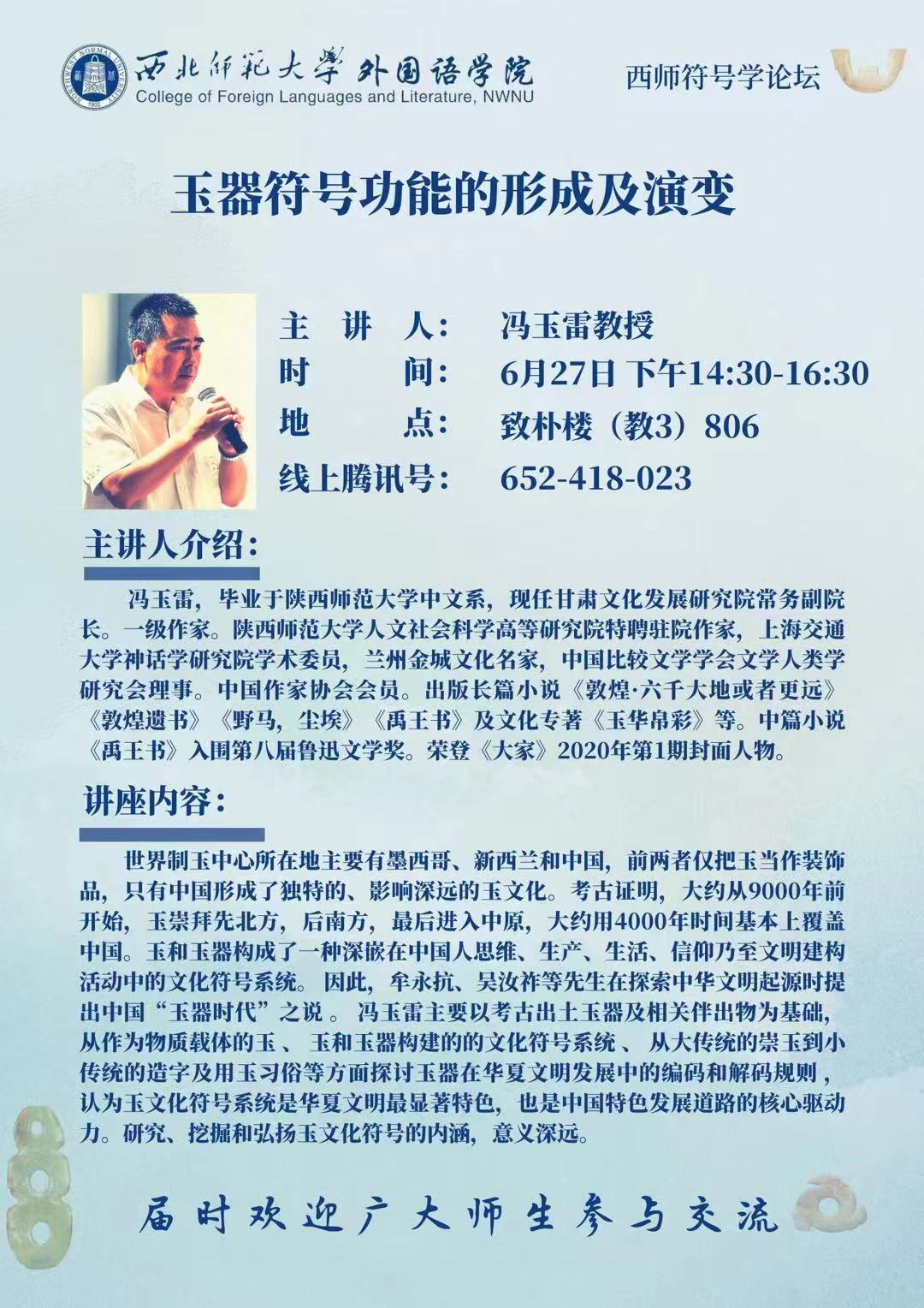 由甘肅文化發(fā)展研究院常務(wù)副院長、一級作家馮玉雷主講的《玉器符號功能的形成及演變》將于6月27日下午在西北師范大學(xué)舉辦。此項(xiàng)活動(dòng)是西北師范大學(xué)外國語學(xué)院西師符號學(xué)論壇系列講座之一,旨在促進(jìn)玉文化與符號學(xué)的融合研究。