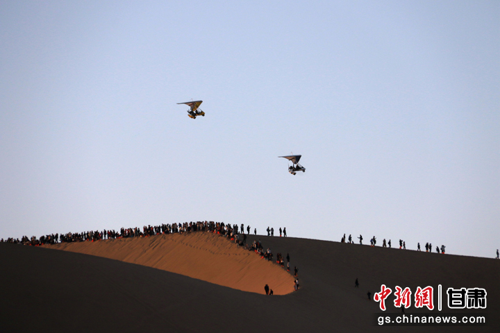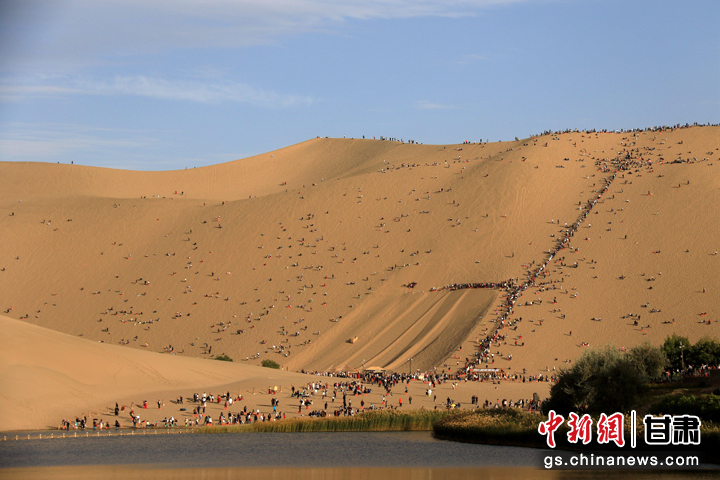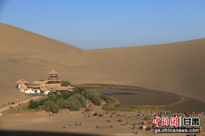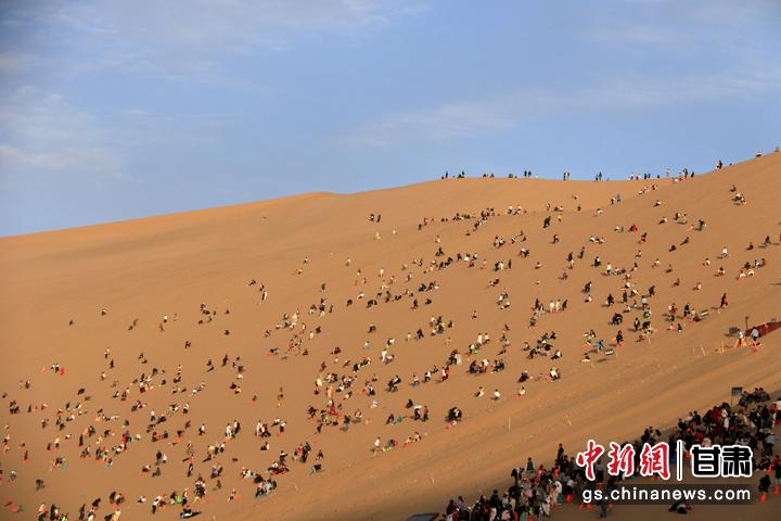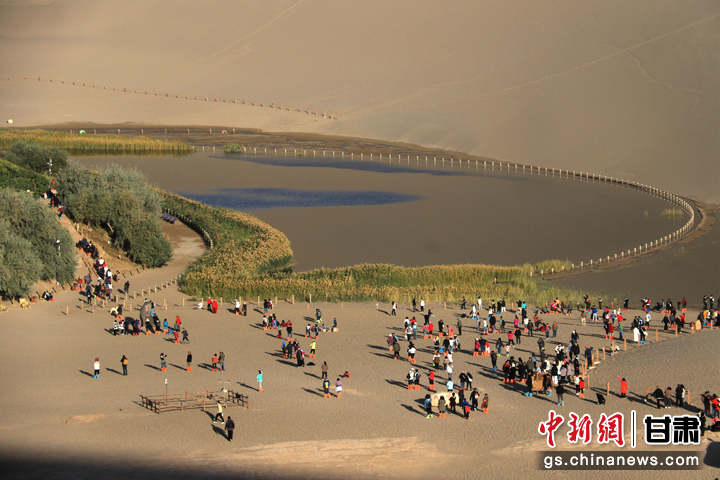 今年以來,甘肅省敦煌市旅游市場持續(xù)火熱。當(dāng)?shù)刂包c(diǎn)鳴沙山月牙泉在今年中秋國慶假期期間,累計(jì)接待游客首次突破300萬人次,比2019年同期增長35.5%,創(chuàng)歷史新高。(張曉亮 習(xí)剛)