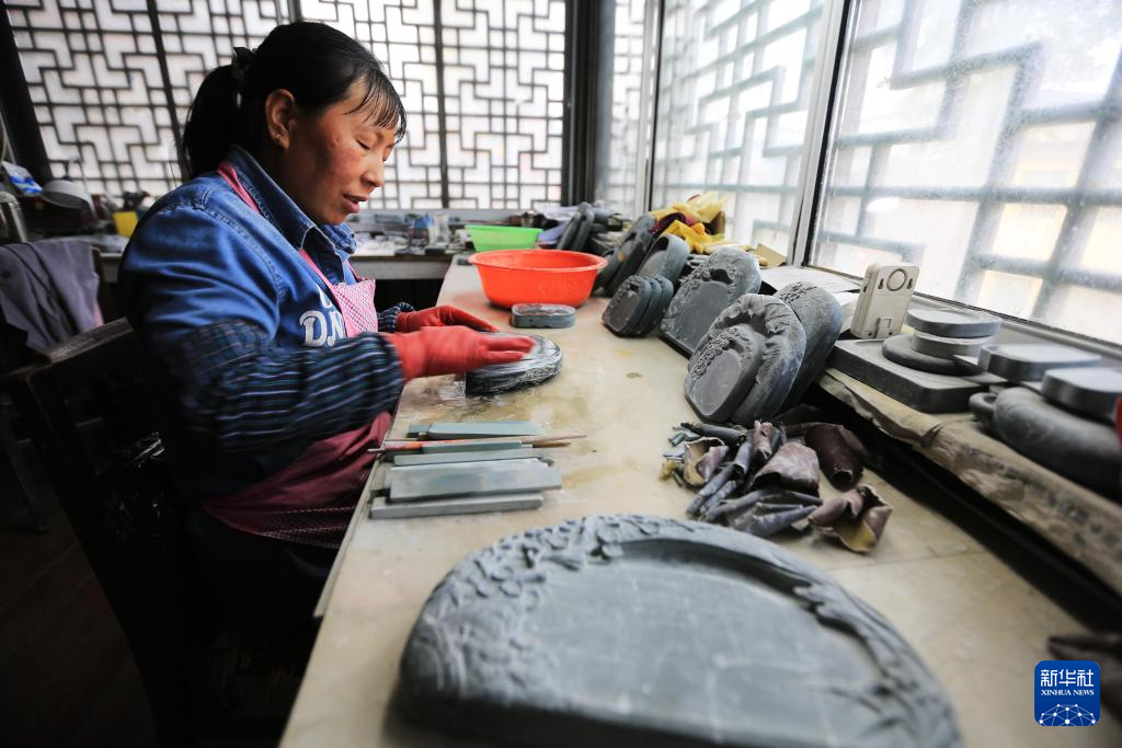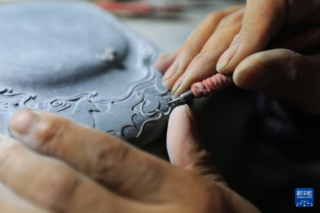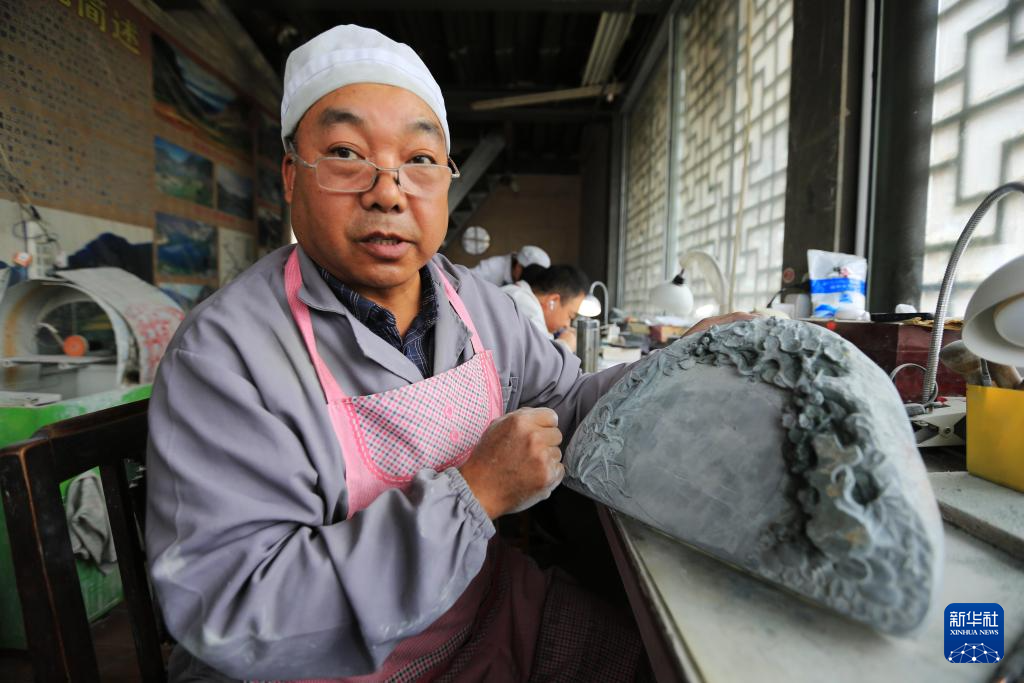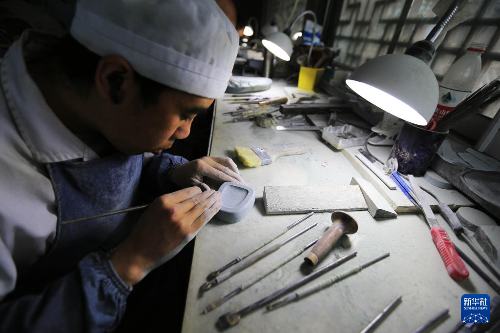 10月24日,藝人在甘肅省定西市臨洮縣洮硯藝術(shù)館雕刻制作洮硯。新華社發(fā)(王克賢 攝)