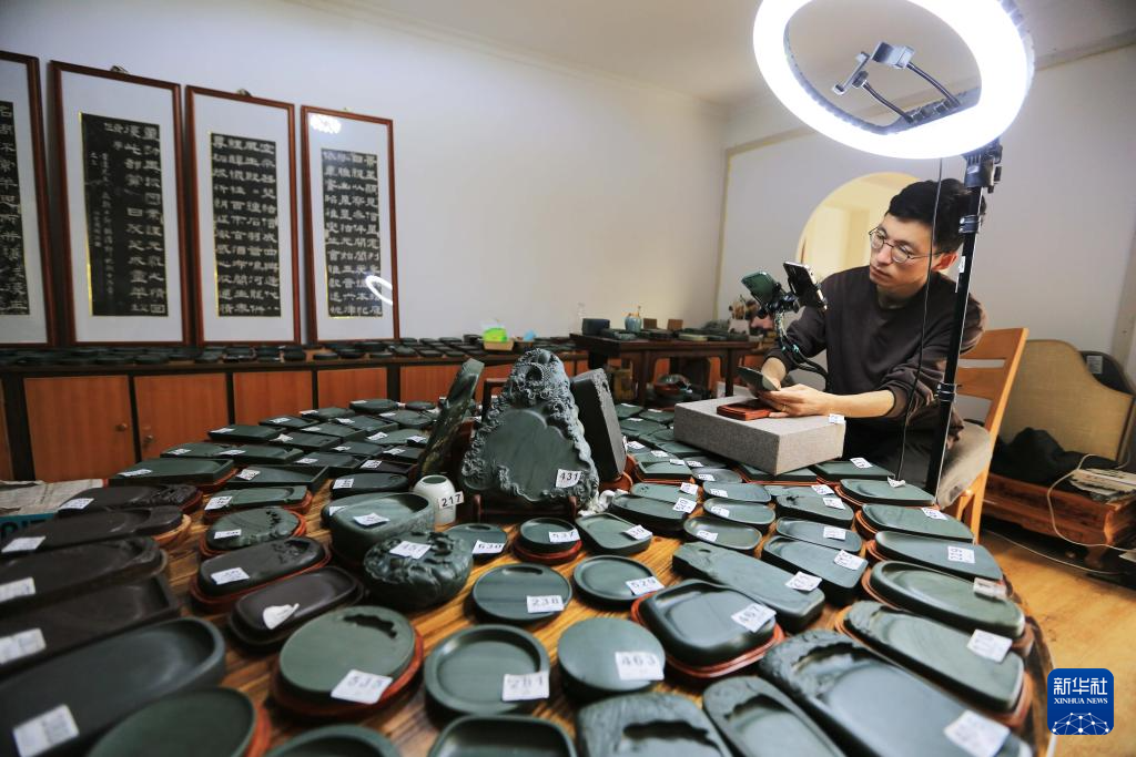 10月24日,工作人員在甘肅省定西市臨洮縣直播銷售洮硯。新華社發(fā)(王克賢 攝)