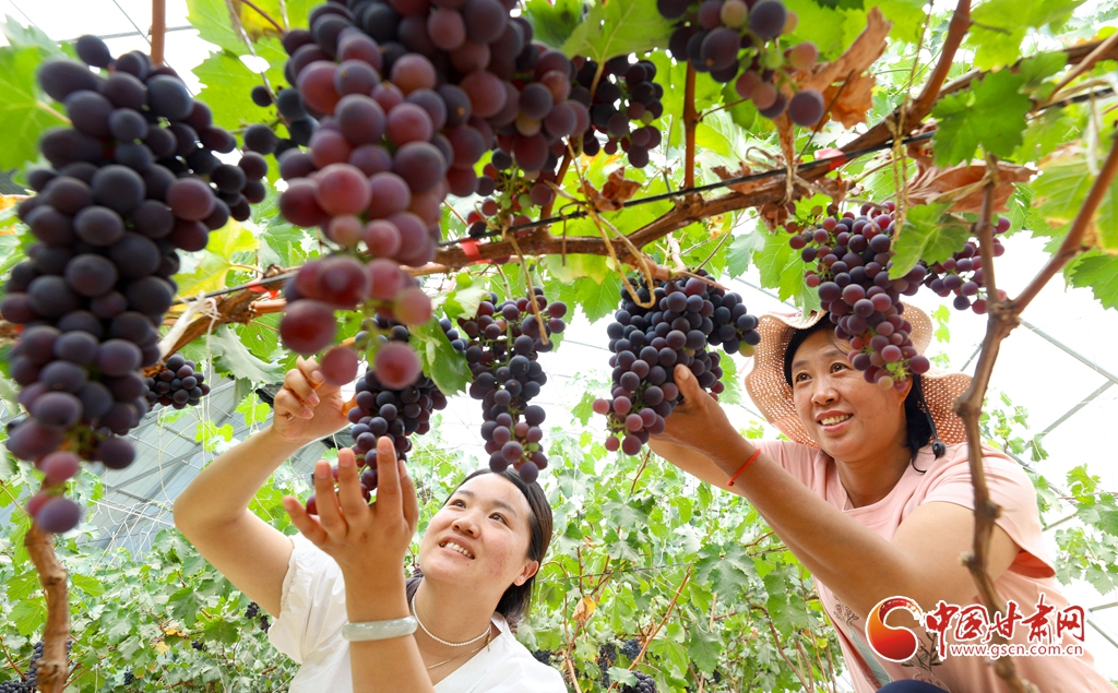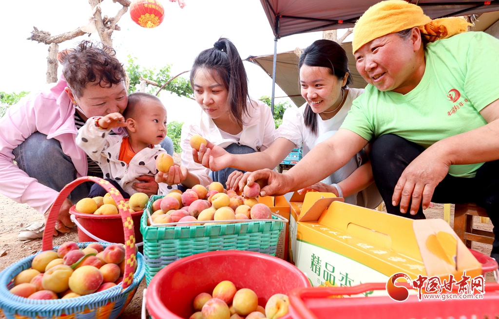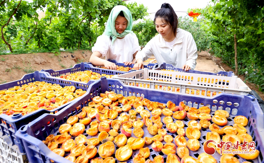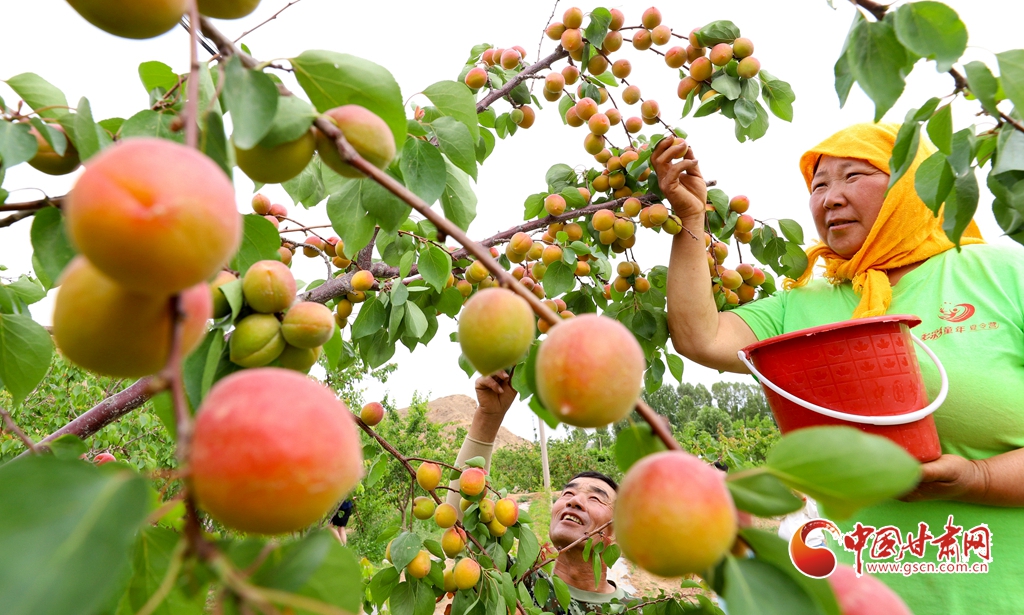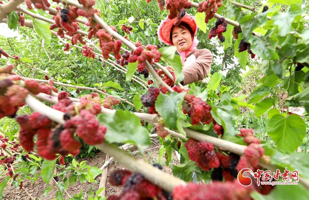 6月5日,在張掖市臨澤縣板橋鎮(zhèn),果農們正在采摘成熟的杏子、桑葚、葡萄。