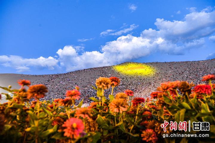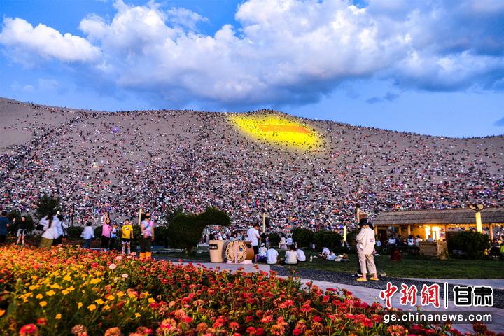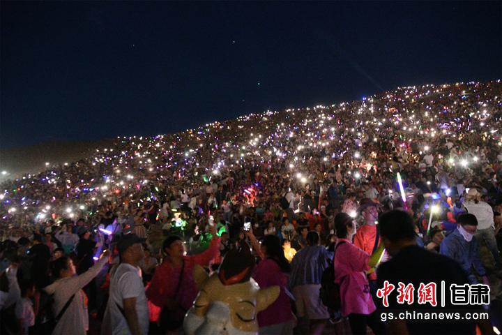 圖為敦煌鳴沙山上,上萬名游客靜待萬人星空演唱會開幕。王斌銀 攝