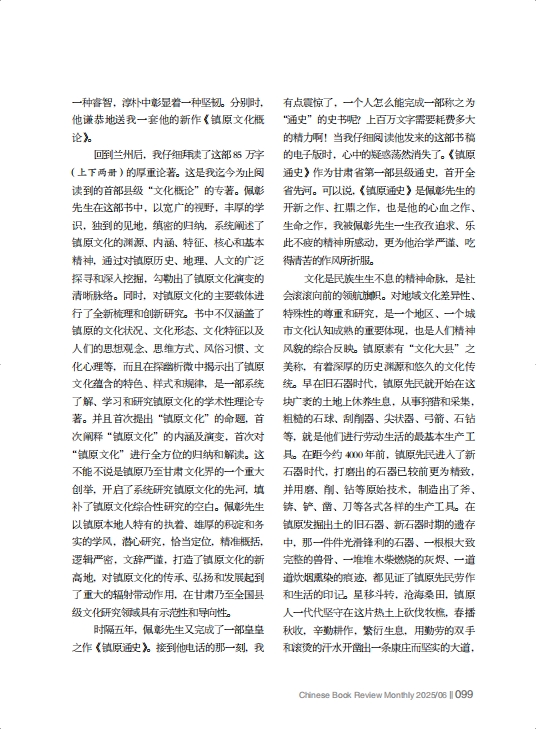 回到蘭州后,我仔細(xì)拜讀了這部85萬字(上下兩冊)的厚重論著。這是我迄今為止閱讀到的首部縣級“文化概論”的專著。佩彰先生在這部書中,以寬廣的視野,豐厚的學(xué)識,獨到的見地,縝密的歸納,系統(tǒng)闡述了鎮(zhèn)原文化的淵源、內(nèi)涵、特征、核心和基本精神,通過對鎮(zhèn)原歷史、地理、人文的廣泛探尋和深入挖掘,勾勒出了鎮(zhèn)原文化演變的清晰脈絡(luò)。同時,對鎮(zhèn)原文化的主要載體進(jìn)行了全新梳理和創(chuàng)新研究。書中不僅涵蓋了鎮(zhèn)原的文化狀況、文化形態(tài)、文化特征以及人們的思想觀念、思維方式、風(fēng)俗習(xí)慣、文化心理等,而且在探幽析微中揭示出了鎮(zhèn)原文化蘊含的特色、樣式和規(guī)律,是一部系統(tǒng)了解、學(xué)習(xí)和研究鎮(zhèn)原文化的學(xué)術(shù)性理論專著。并且首次提出“鎮(zhèn)原文化”的命題,首次闡釋“鎮(zhèn)原文化”的內(nèi)涵及演變,首次對“鎮(zhèn)原文化”進(jìn)行全方位的歸納和解讀。這不能不說是鎮(zhèn)原乃至甘肅文化界的一個重大創(chuàng)舉,開啟了系統(tǒng)研究鎮(zhèn)原文化的先河,填補(bǔ)了鎮(zhèn)原文化綜合性研究的空白。佩彰先生以鎮(zhèn)原本地人特有的執(zhí)著、雄厚的積淀和務(wù)實的學(xué)風(fēng),潛心研究,恰當(dāng)定位,精準(zhǔn)概括,邏輯嚴(yán)密,文辭嚴(yán)謹(jǐn),打造了鎮(zhèn)原文化的新高地,對鎮(zhèn)原文化的傳承、弘揚和發(fā)展起到了重大的輻射帶動作用,在甘肅乃至全國縣級文化研究領(lǐng)域具有示范性和導(dǎo)向性。