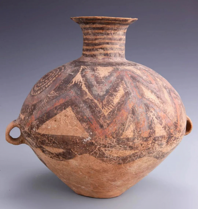彩陶蛙紋壺,新石器時代馬家窯文化馬廠類型,高42厘米,口徑13.1厘米。壺泥質紅陶,口外侈,薄唇,球形腹,小平底,腹部兩側對稱置雙系。于橙紅色陶衣上以黑彩描繪變形蛙紋。圖案線條流暢,富于變化,與造型協(xié)調一致。據(jù)科學測試,馬家窯文化馬廠類型彩陶的年代約為公元前2200~前2000年。變形蛙紋作為馬家窯文化馬廠類型彩陶上常見的裝飾紋樣之一,體現(xiàn)了遠古人們對于繁衍生殖的渴望。青蛙產下許多卵,孵出許多蝌蚪,正是繁衍旺盛的象征。