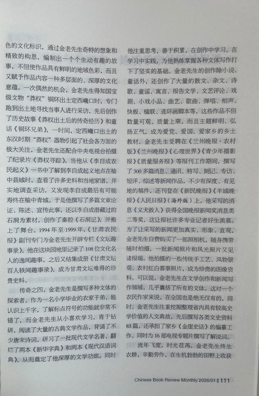 傳奇之四,金老先生是撰寫多種文體的探索者。作為一名小學畢業(yè)的農(nóng)家子弟,能認識上千字,了解標點符號的功能就非常不錯了,而金老先生從小喜歡學習,肯于鉆研,閱讀了大量的古典文學作品,背誦了不少唐宋詩詞,研習了一批現(xiàn)代文學名著,翻爛了兩本《新華字典》和兩本《現(xiàn)代漢語詞典》,從而奠定了他深厚的文學功底。同時他注重思考,善于積累,在創(chuàng)作中學習,在學習中實踐,為他熟練掌握各種文體寫作打下了堅實的基礎(chǔ)。金老先生的創(chuàng)作除小說、童話外,還創(chuàng)作了大量的散文、雜文、詩歌、童謠、寓言、報告文學、文藝評論、戲劇、小戲小品、曲藝、歌曲、彈唱、相聲、快板、楹聯(lián)、連環(huán)畫腳本等,這些作品不但數(shù)量可觀、質(zhì)量上乘,而且主題鮮明、弘揚正氣,成為愛黨、愛國、愛家鄉(xiāng)的鄉(xiāng)土教材。金老先生受聘在《蘭州晚報·農(nóng)村版》《蘭州晚報》《心理世界》《青少年攝影報》《質(zhì)量服務(wù)報》等報刊工作期間,撰寫了300多篇消息、通訊、特寫、側(cè)記、專訪、短評、綜述等新聞作品,不少有深度、有見地的稿件,還刊登在《新民晚報》《羊城晚報》《人民日報》(海外版)上。他采寫的消息《義犬救人》獲得全國晚報新聞獎消息類二等獎,這讓報社許多專業(yè)記者好生羨慕。為了讓采寫的新聞更加真實、形象、直觀,金老先生自費購買了一部照相機,隨身攜帶隨時拍攝,一批新聞?wù)掌惋L光照片又見諸報端。他拍攝的一些傳統(tǒng)手工藝、風物景觀、農(nóng)村紅白喜事照片,成為珍貴的圖像資料??梢哉f,金老先生在文學創(chuàng)作和新聞寫作領(lǐng)域,幾乎囊括了所有的文體,這對一個農(nóng)民作家來說,在全國也是絕無僅有的。同時,金老先生注重挖掘整理省內(nèi)具有較高史學價值的人文典故,先后撰寫各類文史資料83篇,還承擔了家鄉(xiāng)《金崖史話》的編纂工作,同時為16部電視專題片撰寫了解說詞。