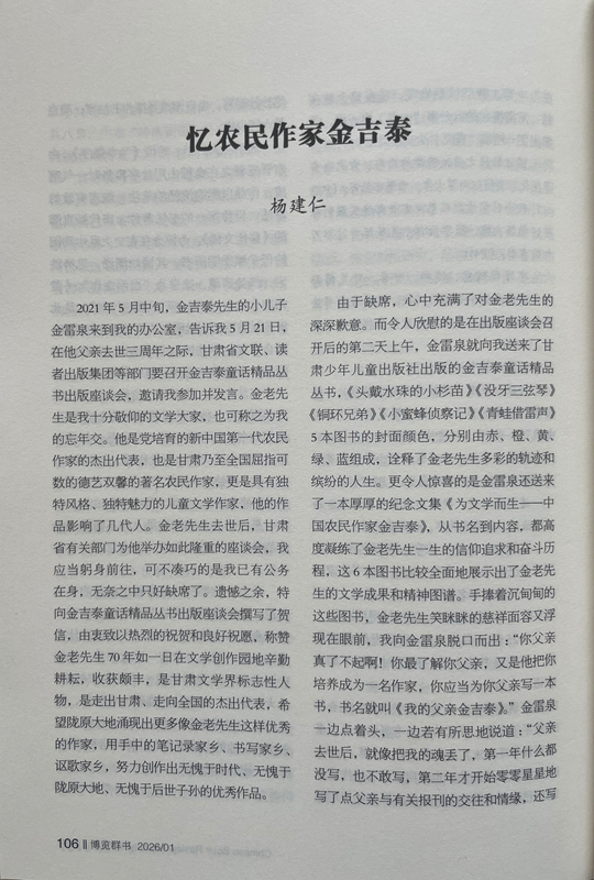 由于缺席,心中充滿了對金老先生的深深歉意。而令人欣慰的是在出版座談會召開后的第二天上午,金雷泉就向我送來了甘肅少年兒童出版社出版的金吉泰童話精品叢書,《頭戴水珠的小杉苗》《沒牙三弦琴》《銅環(huán)兄弟》《小蜜蜂偵察記》《青蛙借雷聲》5本圖書的封面顏色,分別由赤、橙、黃、綠、藍組成,詮釋了金老先生多彩的軌跡和繽紛的人生。更令人驚喜的是金雷泉還送來了一本厚厚的紀念文集《為文學而生——中國農(nóng)民作家金吉泰》,從書名到內(nèi)容,都高度凝練了金老先生一生的信仰追求和奮斗歷程,這6本圖書比較全面地展示出了金老先生的文學成果和精神圖譜。手捧著沉甸甸的這些圖書,金老先生笑瞇瞇的慈祥面容又浮現(xiàn)在眼前,我向金雷泉脫口而出:“你父親真了不起啊!你最了解你父親,又是他把你培養(yǎng)成為一名作家,你應(yīng)當為你父親寫一本書,書名就叫《我的父親金吉泰》。”金雷泉一邊點著頭,一邊若有所思地說道:“父親去世后,就像把我的魂丟了,第一年什么都沒寫,也不敢寫,第二年才開始零零星星地寫了點父親與有關(guān)報刊的交往和情緣,還寫了點父親在生活和寫作中的軼事趣聞。您的建議非常好,我擔心駕馭不好,試試看吧。”我感覺金雷泉有點為難,馬上又安慰他:“不急,你用兩三年時間慢慢寫。”