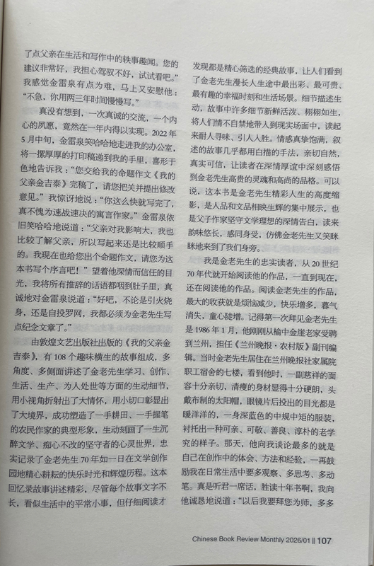 由敦煌文藝出版社出版的《我的父親金吉泰》,有108個趣味橫生的故事組成,多角度、多側(cè)面講述了金老先生學習、創(chuàng)作、生活、生產(chǎn)、為人處世等方面的生動細節(jié),用小視角折射出了大情懷,用小切口彰顯出了大境界,成功塑造了一手耕田、一手握筆的農(nóng)民作家的典型形象,生動刻畫了一生沉醉文學、癡心不改的堅守者的心靈世界,忠實記錄了金老先生70年如一日在文學創(chuàng)作園地精心耕耘的快樂時光和輝煌歷程。這本回憶錄故事講述精彩,盡管每個故事文字不長,看似生活中的平常小事,但仔細閱讀才發(fā)現(xiàn)都是精心篩選的經(jīng)典故事,讓人們看到了金老先生漫長人生途中最出彩、最可貴、最有趣的幸福時刻和生活場景。細節(jié)描述生動,故事中許多細節(jié)新鮮活潑、栩栩如生,將人們情不自禁地帶入到現(xiàn)實場面中,讀起來耐人尋味、引人入勝。情感真摯飽滿,敘述的故事幾乎都用白描的手法,親切自然,真實可信,讓讀者在深情厚誼中深刻感悟到金老先生高貴的靈魂和高尚的品格??梢哉f,這本書是金老先生精彩人生的高度縮影,是人品和文品相映生輝的集中展示,也是父子作家堅守文學理想的深情告白,讀來韻味悠長,感同身受,仿佛金老先生又笑瞇瞇地來到了我們身旁。