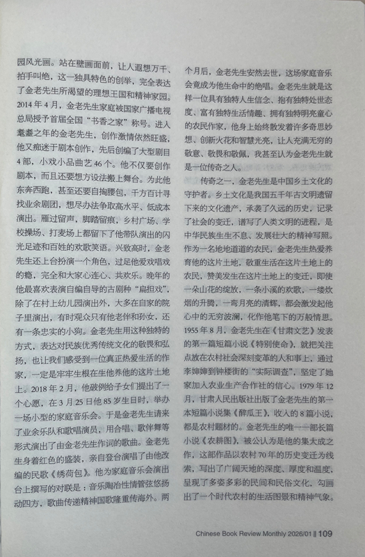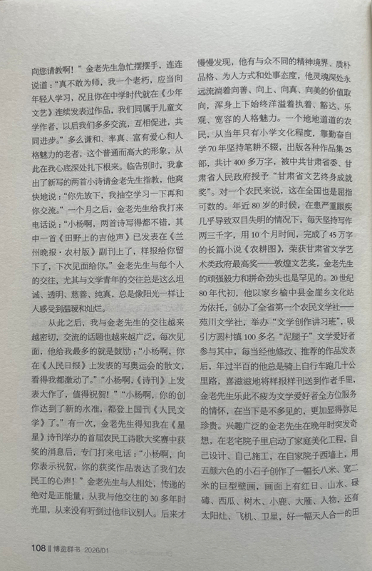 從此之后,我與金老先生的交往越來越密切,交流的話題也越來越廣泛,每次見面,他給我最多的就是鼓勵:“小楊啊,你在《人民日報》上發(fā)表的寫奧運會的散文,看得我都激動了。”“小楊啊,《詩刊》上發(fā)表大作了,值得祝賀!”“小楊啊,你的創(chuàng)作達到了新的水準,都登上國刊《人民文學》了。”有一次,金老先生得知我在《星星》詩刊舉辦的首屆農(nóng)民工詩歌大獎賽中獲獎的消息后,專門打來電話:“小楊啊,向你表示祝賀,你的獲獎作品表達了我們農(nóng)民工的心聲!”金老先生與人相處,傳遞的絕對是正能量,從我與他交往的30多年時光里,從來沒有聽到過他非議別人。后來才慢慢發(fā)現(xiàn),他有與眾不同的精神境界、質(zhì)樸品格、為人方式和處事態(tài)度,他靈魂深處永遠流淌著向善、向上、向真、向美的價值取向,渾身上下始終洋溢著執(zhí)著、豁達、樂觀、寬容的人格魅力。一個地地道道的農(nóng)民,從當年只有小學文化程度,靠勤奮自學70年堅持筆耕不輟,出版各種作品集25部,共計400多萬字,被中共甘肅省委、甘肅省人民政府授予“甘肅省文藝終身成就獎”。對一個農(nóng)民來說,這在全國也是屈指可數(shù)的。年近80歲的時候,在患嚴重眼疾幾乎導致雙目失明的情況下,每天堅持寫作兩三千字,用10個月時間,完成了45萬字的長篇小說《農(nóng)耕圖》,榮獲甘肅省文學藝術(shù)類政府最高獎——敦煌文藝獎,金老先生的頑強毅力和拼命勁頭也是罕見的。20世紀80年代初,他以家鄉(xiāng)榆中縣金崖鄉(xiāng)文化站為依托,創(chuàng)辦了全省第一個農(nóng)民文學社——苑川文學社,舉辦“文學創(chuàng)作講習班”,吸引方圓村鎮(zhèn)100多名“泥腿子”文學愛好者參與其中,每當經(jīng)他修改、推薦的作品發(fā)表后,年過半百的他總是騎上自行車跑幾十公里路,喜滋滋地將樣報樣刊送到作者手里,金老先生樂此不疲為文學愛好者全方位服務(wù)的情懷,在當下是不多見的,更加顯得彌足珍貴。興趣廣泛的金老先生在晚年時突發(fā)奇想,在老宅院子里啟動了家庭美化工程,自己設(shè)計、自己施工,在自家院子西墻上,用五顏六色的小石子創(chuàng)作了一幅長八米、寬二米的巨型壁畫,畫面上有紅日、山水、碌碡、西瓜、樹木、小鹿、大雁、人物,還有太陽灶、飛機、衛(wèi)星,好一幅天人合一的田園風光畫。站在壁畫面前,讓人遐想萬千、拍手叫絕,這一獨具特色的創(chuàng)舉,完全表達了金老先生所渴望的理想王國和精神家園。2014年4月,金老先生家庭被國家廣播電視總局授予首屆全國“書香之家”稱號。進入耄耋之年的金老先生,創(chuàng)作激情依然旺盛,他又癡迷于劇本創(chuàng)作,先后創(chuàng)編了大型劇目4部,小戲小品曲藝46個。他不僅要創(chuàng)作劇本,而且還要想方設(shè)法搬上舞臺。為此他東奔西跑,甚至還要自掏腰包,千方百計尋找業(yè)余劇團,想盡辦法爭取高水平、低成本演出。雁過留聲,腳踏留痕,鄉(xiāng)村廣場、學校操場、打麥場上都留下了他帶隊演出的閃光足跡和百姓的歡歌笑語。興致高時,金老先生還上臺扮演一個角色,過足他愛戲唱戲的癮,完全和大家心連心、共歡樂。晚年的他最喜歡表演自編自導的古劇種“扁擔戲”,除了在村上幼兒園演出外,大多在自家的院子里演出,有時觀眾只有他老伴和孫女,還有一條忠實的小狗。金老先生用這種獨特的方式,表達對民族優(yōu)秀傳統(tǒng)文化的敬畏和弘揚,也讓我們感受到一位真正熱愛生活的作家,一定是牢牢生根在生他養(yǎng)他的這片土地上。2018年2月,他破例給子女們提出了一個心愿,在3月25日他85歲生日時,舉辦一場小型的家庭音樂會。于是金老先生請來了業(yè)余樂隊和歌唱演員,用合唱、歌伴舞等形式演出了由金老先生作詞的歌曲。金老先生身著紅色的盛裝,親自登臺演唱了由他改編的民歌《繡荷包》。他為家庭音樂會演出臺上撰寫的對聯(lián)是:音樂陶冶性情管弦悠揚動四方,歌曲傳遞精神國歌隆重傳海外。兩個月后,金老先生安然去世,這場家庭音樂會竟成為他生命中的絕唱。金老先生就是這樣一位具有獨特人生信念、抱有獨特處世態(tài)度、富有獨特生活情趣、擁有獨特明亮童心的農(nóng)民作家,他身上始終散發(fā)著許多奇思妙想、創(chuàng)新火花和智慧光亮,讓人充滿無窮的敬意、敬畏和敬佩,我甚至認為金老先生就是一位傳奇之人。