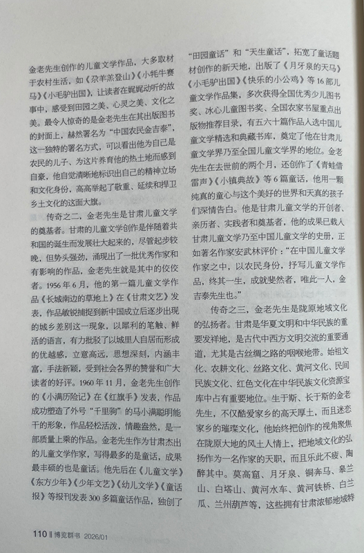 傳奇之二,金老先生是甘肅兒童文學的奠基者。甘肅的兒童文學創(chuàng)作是伴隨著共和國的誕生而發(fā)展壯大起來的,盡管起步較晚,但勢頭強勁,涌現(xiàn)出了一批優(yōu)秀作家和有影響的作品,金老先生就是其中的佼佼者。1956年6月,他的第一篇兒童文學作品《長城南邊的草地上》在《甘肅文藝》發(fā)表,作品敏銳捕捉到新中國成立后逐步出現(xiàn)的城鄉(xiāng)差別這一現(xiàn)象,以犀利的筆觸、鮮活的語言,有力批駁了以城里人自居而形成的優(yōu)越感,立意高遠,思想深刻,內(nèi)涵豐富,手法新穎,受到社會各界的贊譽和廣大讀者的好評。1960年11月,金老先生創(chuàng)作的《小滿歷險記》在《紅旗手》發(fā)表,作品成功塑造了外號“千里駒”的馬小滿聰明能干的形象,作品輕松活潑,情趣盎然,是一部質(zhì)量上乘的作品。金老先生作為甘肅杰出的兒童文學作家,寫得最多的是童話,成果最豐碩的也是童話。他先后在《兒童文學》《東方少年》《少年文藝》《幼兒文學》《童話報》等報刊發(fā)表300多篇童話作品,獨創(chuàng)了“田園童話”和“天生童話”,拓寬了童話題材創(chuàng)作的新天地,出版了《月牙泉的天馬》《小毛驢出國》《快樂的小公雞》等16部兒童文學作品集,多次獲得全國優(yōu)秀少兒圖書獎、冰心兒童圖書獎、全國農(nóng)家書屋重點出版物推薦目錄,有五六十篇作品入選中國兒童文學精選和典藏書庫,奠定了他在甘肅兒童文學界乃至全國兒童文學界的地位。金老先生在去世前的兩個月,還創(chuàng)作了《青蛙借雷聲》《小鎮(zhèn)典故》等6篇童話,他用一顆純真的童心與這個美好的世界和天真的孩子們深情告白。他是甘肅兒童文學的開創(chuàng)者、親歷者、實踐者和奠基者,他的成果已載入甘肅兒童文學乃至中國兒童文學的史冊,正如著名作家安武林評價:“在中國兒童文學作家之中,以農(nóng)民身份,抒寫兒童文學作品,終其一生,成就斐然者,唯此一人,金吉泰先生也。”