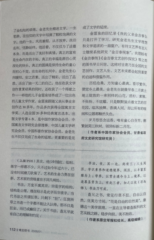 金雷泉的回憶錄《我的父親金吉泰》,只是打開了學習、研究金老先生文學理想和文學追求的一扇窗戶,有待文藝界有志人士繼續(xù)系統(tǒng)研究“金吉泰現(xiàn)象”。我期盼有《金吉泰傳》《金吉泰文藝創(chuàng)作探究》等之類的圖書早日問世,這將對甘肅乃至全國的文藝創(chuàng)作、文藝人生、文藝未來都會起到重要的啟迪和借鑒作用。