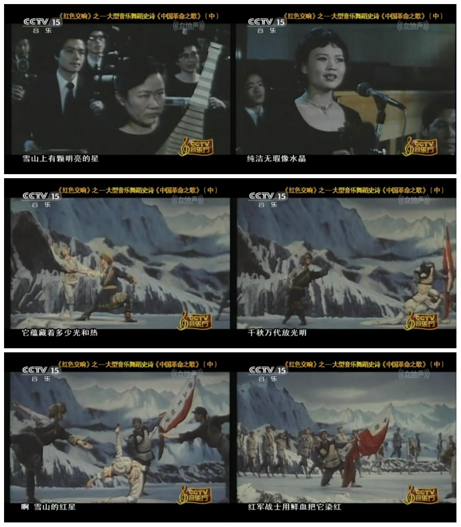 而在音樂與舞蹈的融合道路上,創(chuàng)作于1984年的大型音樂舞蹈史詩《中國革命之歌》,邁向了一種更為宏大的藝術形態(tài)。作品融舞蹈、音樂、朗誦與舞臺視覺于一體,以全景敘事回溯革命征程。其中第三時期的片段《紅軍不怕遠征難》,以“雪山紅星”為核心意象,在交響樂、合唱與舞蹈的交織中,唱響了那段艱苦卓絕的歷程。