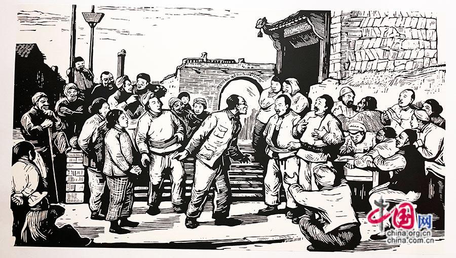 木刻版畫《馬錫五審判方式》 中國網(wǎng)記者 唐佳蕾/攝