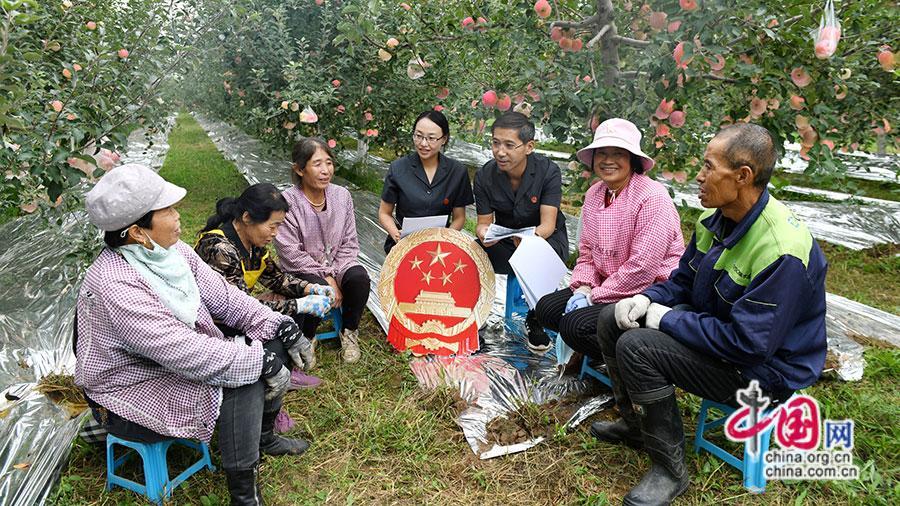 西峰區(qū)法院后官寨法庭法官在巡回審判后為果農(nóng)普法。中國網(wǎng)發(fā) 慶陽市中級人民法院供圖