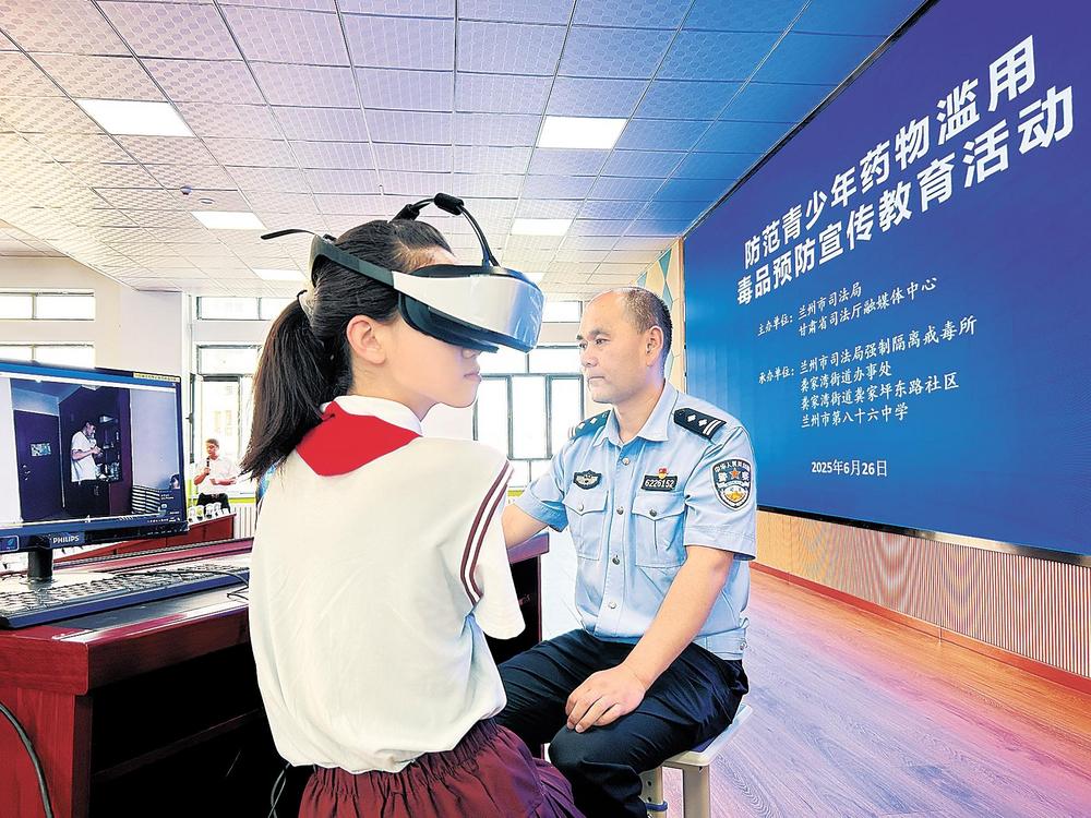 2025年6月26日,蘭州市司法局強(qiáng)制隔離戒毒所干警走進(jìn)蘭州市第八十六中學(xué)開(kāi)展禁毒宣傳教育。圖為學(xué)生佩戴VR眼鏡,通過(guò)虛擬現(xiàn)實(shí)技術(shù)創(chuàng)造逼真的沾染毒品場(chǎng)景,讓學(xué)生身臨其境地感受毒品的危害。