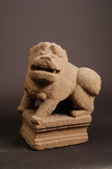 明代,征集。高35厘米,長(zhǎng)26厘米,寬17.5厘米。石獅蹲于虛彌座上,頭昂首左視,頭頂刻劃成旋渦肉髻狀,尾部呈半球狀,上刻梅花形紋飾,頸下飾一毛纓及二鈴鐺,雕刻細(xì)膩。