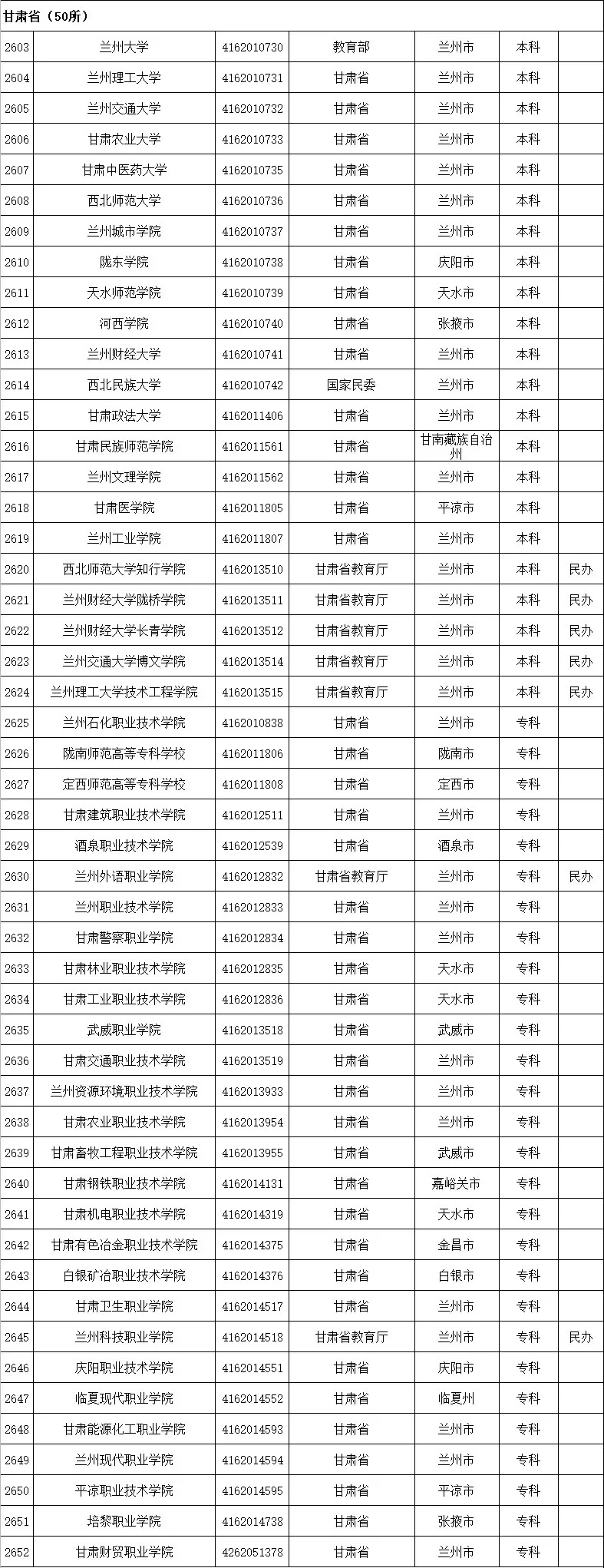 甘肅省共50所