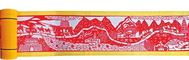 用剪紙藝術再現古絲綢之路的盛景,國家級非遺項目定西剪紙省級代表性傳承人付忠民經過長時間的構思和調研,又歷經5個月,終于創(chuàng)作出了長達23.38米的剪紙長卷——《古絲綢之路全圖》,再現了絲路古道的文化藝術魅力,該長卷曾一舉創(chuàng)下世界紀錄協會“世界上最長的剪紙長卷”的世界紀錄。