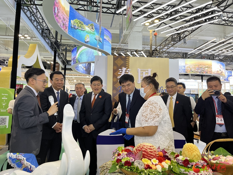 泰國(guó)國(guó)家館展覽面積300平方米,由泰國(guó)駐西安總領(lǐng)事館牽頭組織參展,展區(qū)設(shè)計(jì)采用白金色為主色調(diào),簡(jiǎn)潔明亮,富有泰國(guó)特色。主要展示泰國(guó)特色文化、企業(yè)和產(chǎn)品。展館整體劃分為接待區(qū)、洽談區(qū)、舞臺(tái)表演互動(dòng)區(qū)、泰國(guó)雕刻體驗(yàn)區(qū)、泰式按摩體驗(yàn)區(qū)、模擬泰國(guó)旅游景點(diǎn)拍照區(qū)及產(chǎn)品展示區(qū)等,通過(guò)造型、多媒體、圖片及表演等形式,以Food 美食、Fighting 泰拳、Film 電影、Fashion 時(shí)尚和 Festival 節(jié)日等多元素,全面展示泰國(guó)文化的多元、包容、開(kāi)放與創(chuàng)新的特點(diǎn)。參展企業(yè)共22家,主要展品涵蓋食品、化妝品、居家用品及保健按摩產(chǎn)品等。