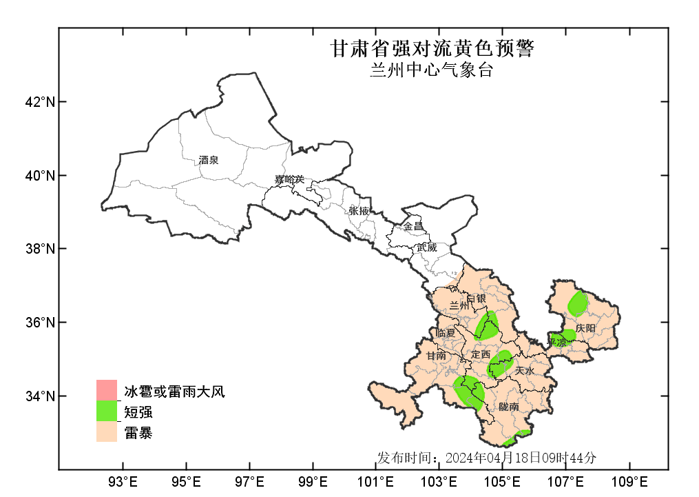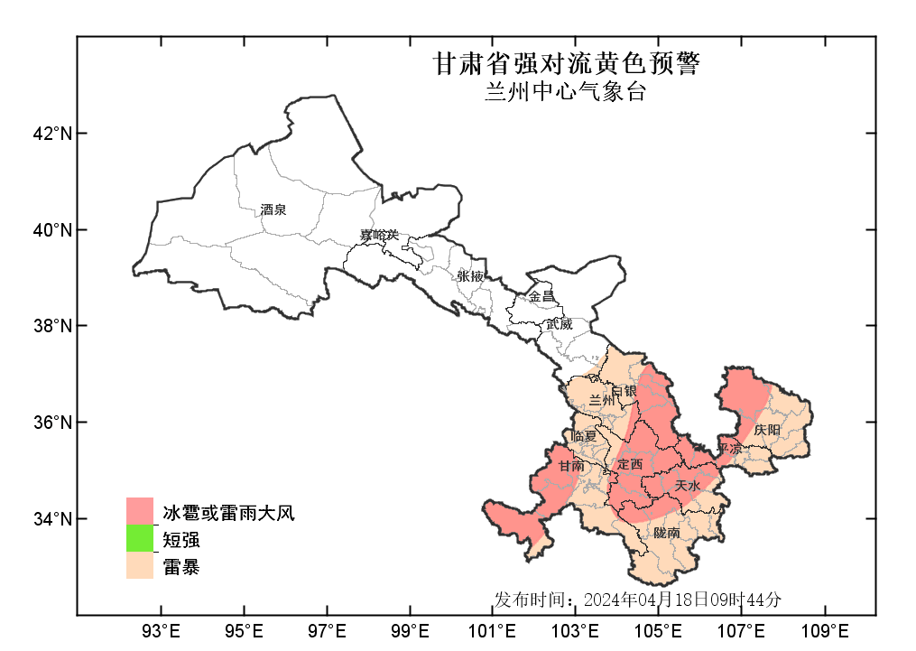 中國甘肅網(wǎng)4月18日訊(西北角·中國甘肅網(wǎng)記者 沈文剛)4月18日9時44分,蘭州中心氣象臺發(fā)布強(qiáng)對流黃色預(yù)警:預(yù)計今天白天到夜間,武威以東大部分地方有雷暴;其中,白銀、定西、甘南、天水等市州部分地方及蘭州、隴南、平?jīng)?、慶陽等市局部地方有雷雨大風(fēng)或冰雹;甘南、隴南、定西、天水、白銀、蘭州、平?jīng)?、慶陽等州市局部地方有短時強(qiáng)降水,最大小時雨強(qiáng)為20-30毫米。