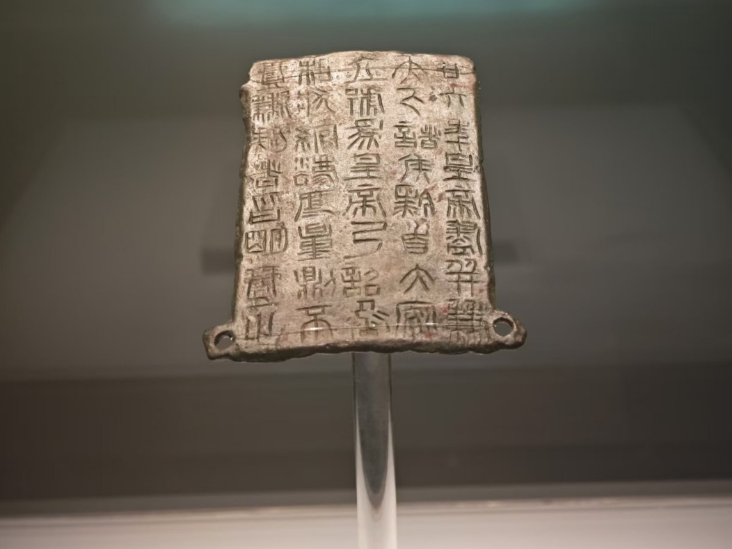 “鎮(zhèn)原縣博物館的鎮(zhèn)館之寶是秦二十六年銅詔版,1976年 4月 1日被鎮(zhèn)原縣城關鎮(zhèn)富坪村建宅取土的農(nóng)民發(fā)現(xiàn)并上交。在1996年 9月,國家文物局鑒定專家組定為國家一級文物。這塊銅詔版上有文字5 行,共40字,字跡清晰,線條纖細,字體為小篆。在用筆結構上既有秦代小篆規(guī)矩整飭的風范,又保留著大篆文字的某些特點。”鎮(zhèn)遠縣博物館講解員介紹道。