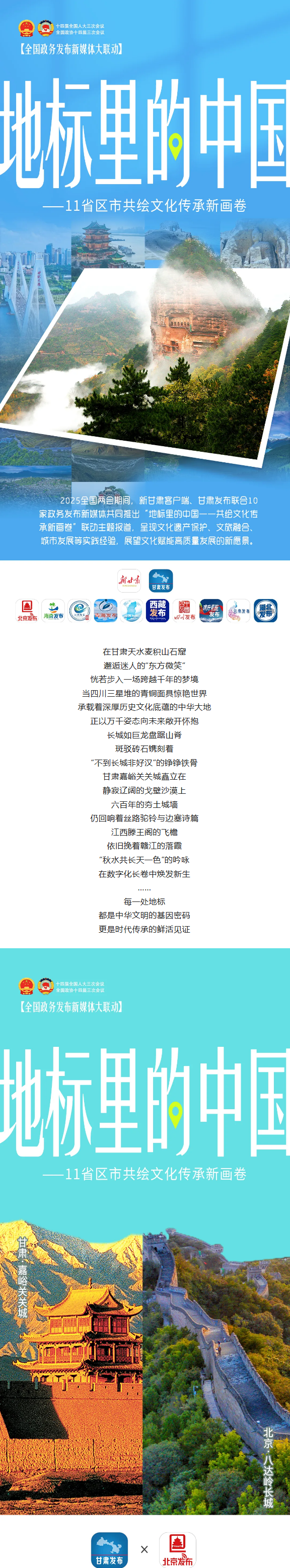 一磚一瓦鐫刻文明密碼,山河萬(wàn)里鋪展傳承畫卷。在2025年全國(guó)兩會(huì)召開之際,甘肅發(fā)布聯(lián)合北京發(fā)布、四川發(fā)布、江西發(fā)布、山西發(fā)布、湖北發(fā)布、云南發(fā)布、青海發(fā)布、新疆發(fā)布、西藏發(fā)布、海南發(fā)布10家政務(wù)發(fā)布新媒體,共同策劃推出“地標(biāo)里的中國(guó)——共繪文化傳承新畫卷”聯(lián)動(dòng)主題報(bào)道,以各地地標(biāo)性建筑為載體,展現(xiàn)中華文化多樣性與傳承創(chuàng)新成果。通過全國(guó)政務(wù)發(fā)布新媒體大聯(lián)動(dòng),呈現(xiàn)文化遺產(chǎn)保護(hù)、文旅融合、城市發(fā)展等寶貴實(shí)踐經(jīng)驗(yàn),展望文化賦能高質(zhì)量發(fā)展的新愿景。