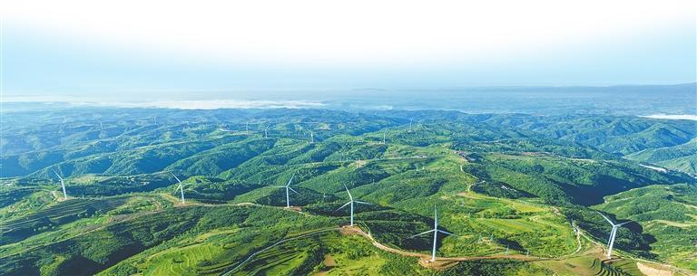 平?jīng)鍪嗅轻紖^(qū)麻武鄉(xiāng)風(fēng)力發(fā)電場,一臺臺風(fēng)力發(fā)電機矗立在群山之巔。新甘肅·甘肅日報通訊員 黃蔚林