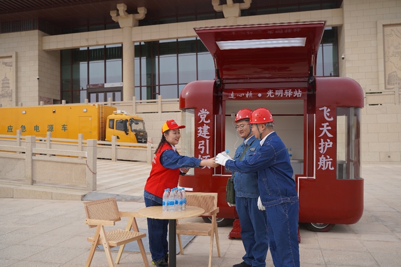 9月20日,在文博會保電現(xiàn)場,一個特殊的服務(wù)點吸引了來往者的目光——該公司設(shè)立的“連心橋·光明驛站”,站內(nèi)設(shè)置免費充電區(qū)、應(yīng)急補(bǔ)給區(qū)、臨時休息區(qū),這個由國家電網(wǎng)甘肅電力(飛天)連心橋共產(chǎn)黨員服務(wù)隊和“黃河之濱”志愿者服務(wù)隊組成的服務(wù)站點,在這場文化盛會中發(fā)揮著重要作用,為各方來賓和市民游客提供全方位的貼心服務(wù),成為文博會上一道亮麗的風(fēng)景線。