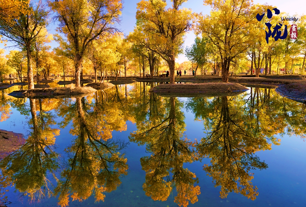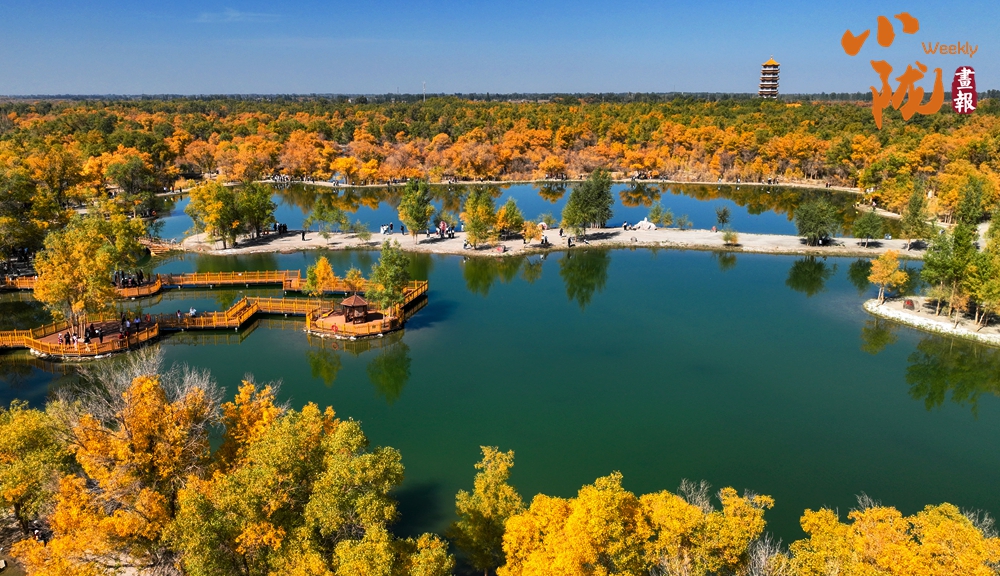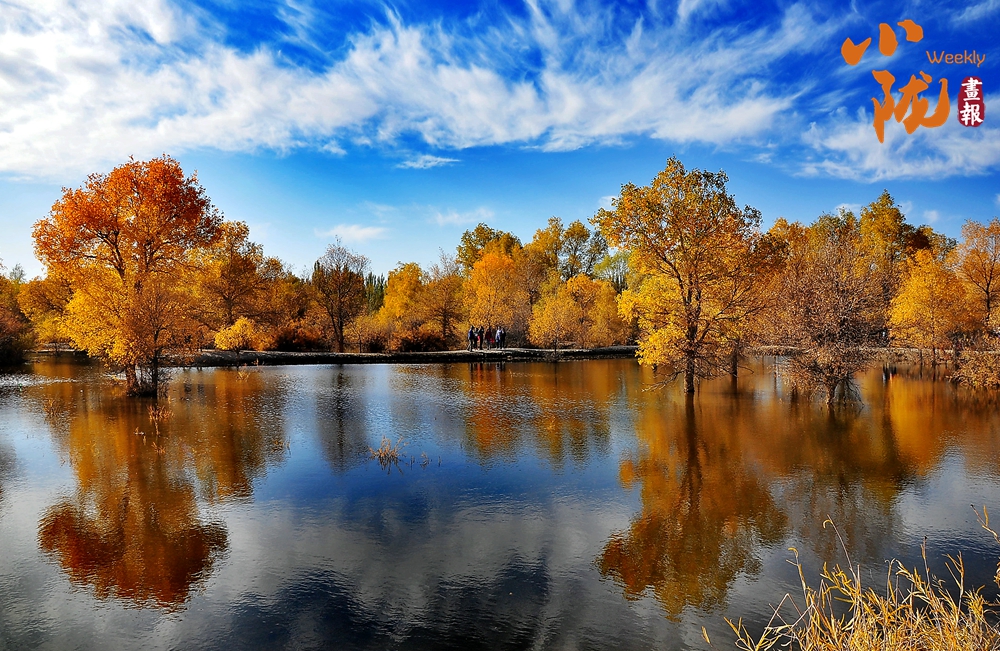胡楊茂盛,疊翠流金,裊裊身姿倒影湖中。風(fēng)一吹,樹梢輕顫,成千上萬(wàn)片葉子像被點(diǎn)燃的火焰,在藍(lán)得沒(méi)有一絲雜質(zhì)的天空下翻涌、跳躍,充滿詩(shī)意。林間小道上,游客悠閑漫步,盡享美好時(shí)光。