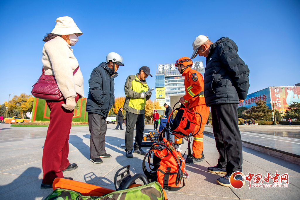 消防隊員給裕固族群眾講解地震救援裝備液壓擴(kuò)張器在救援中的用途