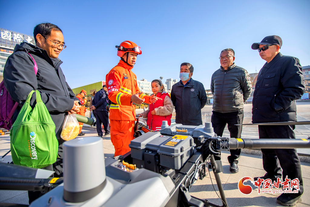 消防隊員給群眾講解無人機(jī)遠(yuǎn)程投送救援物資和處置懸崖峭壁煙點(diǎn)的用途