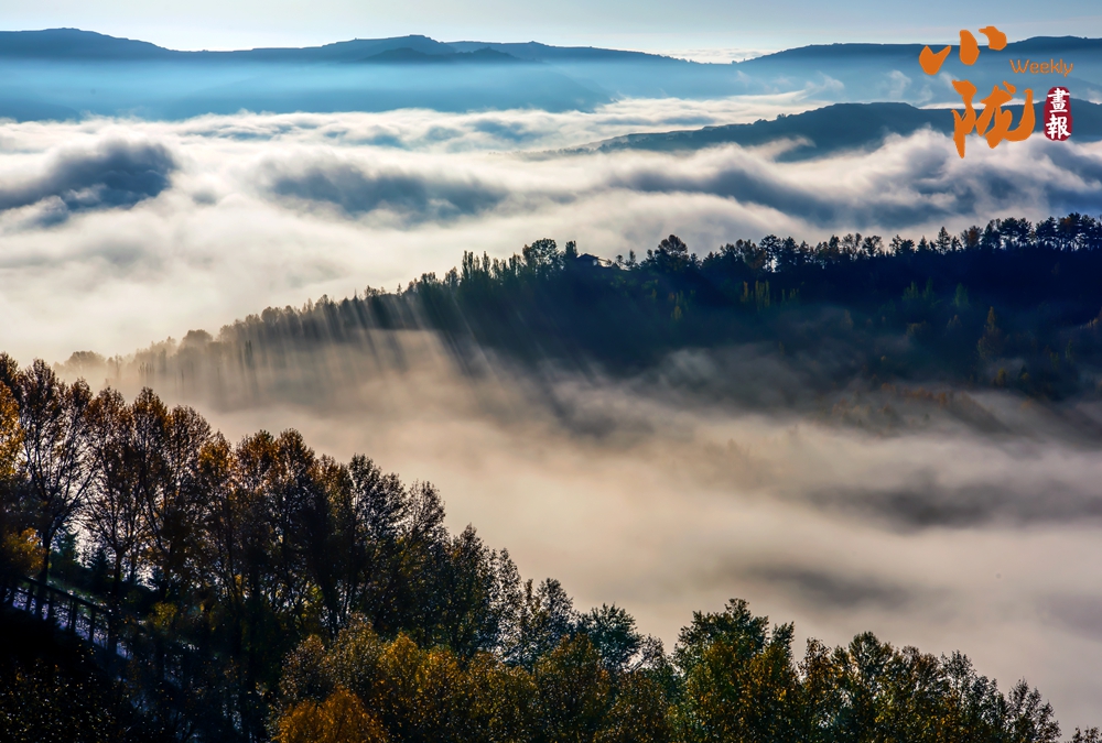 仿佛一夜之間,大北山被染成了暖黃色。極目遠(yuǎn)眺,云海漫過(guò)蒼翠的山脊,與天邊燃燒的晚霞交融成流動(dòng)的錦緞,夢(mèng)幻般的色彩恣意鋪張,金色與藍(lán)天、山坳交織在一起,格外溫馨浪漫。