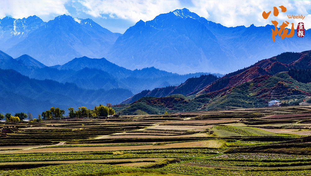 秋風(fēng)溫柔,山川壯美。祁連山腳下,泛黃的草原如同大地鋪開(kāi)的地毯,伸向天際。遠(yuǎn)處的山川,近處的村莊、樹(shù)木沉浸在金色的光芒中,一幅五彩斑斕的秋景圖。