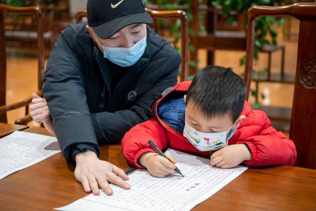 2月6日,小朋友和家長在太原市圖書館參加“觀四庫 抄經(jīng)典”活動。