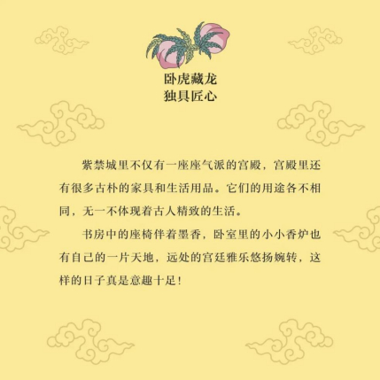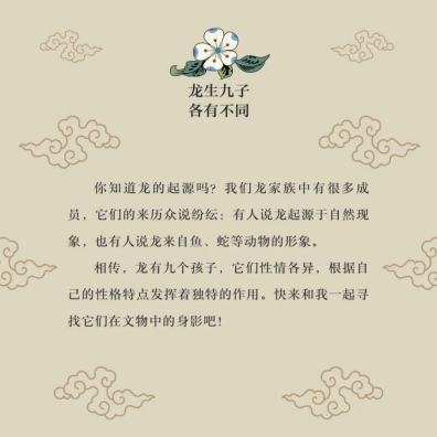 從2月到12月,如意更發(fā)現(xiàn)了“龍生九子”的故事,原來,在鐘鈕上的龍子叫“蒲牢”,在宮門上的龍子叫“椒圖”……在古老的龍家族中,有把身子彎成S形的螭龍,有在空中振翅飛舞的應龍,還有拱起身子趴在壺上的蟠龍……精選的故宮官式建筑上的和璽彩畫、大氣精美的九龍壁和千龍吐水的螭首奇觀,都讓如意著迷而向往。