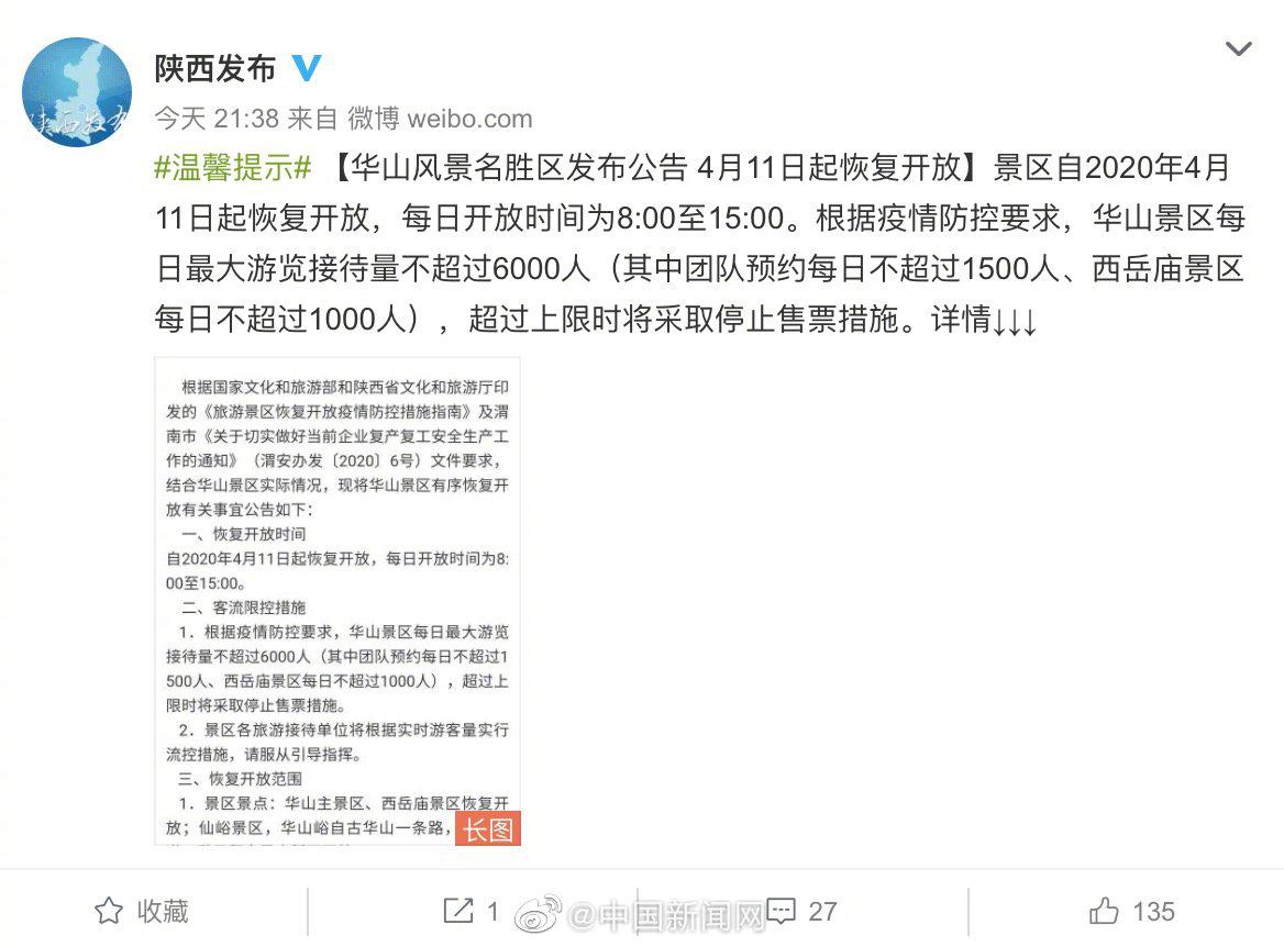華山風景名勝區(qū)4月9日發(fā)布公告,宣布華山風景區(qū)4月11日起恢復開放。據(jù)@陜西發(fā)布 華山風景名勝區(qū)發(fā)布公告稱,自2020年4月11日起恢復開放,每日開放時間為8:00至15:00。