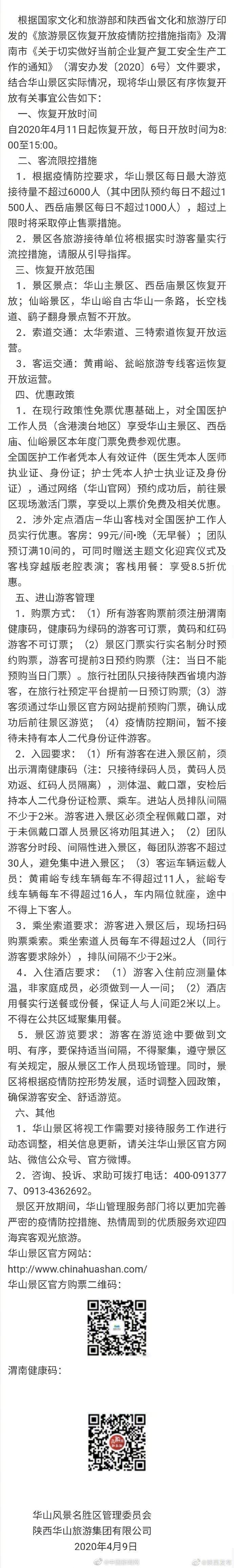 原標題:華山風景區(qū)11日起恢復開放 對醫(yī)護人員免門票