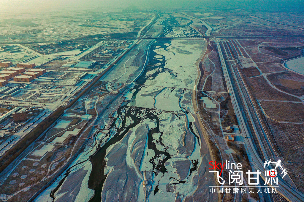 12月2日,雪霽天晴,冰封的黑河和漸凍的蘆水灣湖面上,皚皚白雪與裸露的水面形成丹青畫卷,別有一番趣味。(無人機(jī)照片)