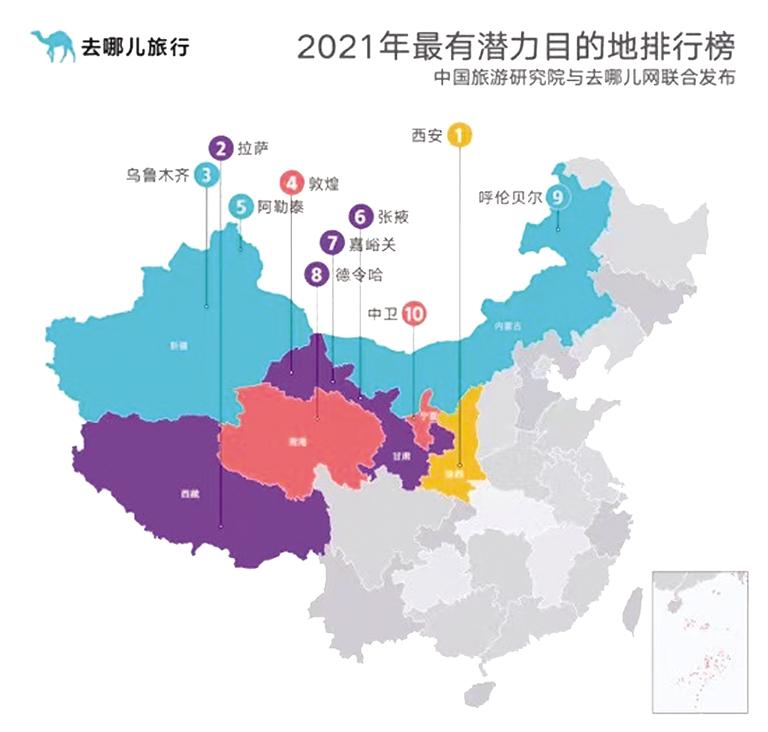 中國旅游研究院與去哪兒網(wǎng)課題組根據(jù)旅游目的地2020年和2019年的預(yù)訂增量、平均價格、出行時間和搜索熱度,發(fā)布2021年最有潛力目的地排行榜和2021年小眾旅游目的地排行榜。其中前十位的目的地包含我省敦煌、張掖、嘉峪關(guān)三座絲路名城,今年西北地區(qū)將在2021年吸引更多游客前往。