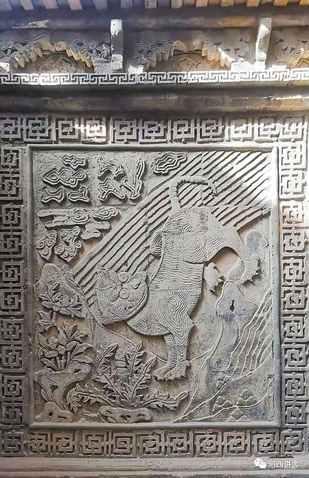 民勤會館建筑的鐘樓、鼓樓和東西別院的門樓、山墻墀頭、照壁等處處有磚雕,堪稱精美,其中運用諧音、象征、隱喻等手法,將民間傳統(tǒng)瑞獸,雕刻其中,栩栩如生。以左青龍、右白虎,東日出,西明月布局。磚雕以龍、虎、鹿、鶴、松柏、牡丹、荷花、竹子、石頭、祥云、日月、博古等寓意吉祥和人們喜聞樂見的內(nèi)容為主。磚雕形象手法簡練,風(fēng)格渾厚,又不失精巧和纖細,值得細細品味。