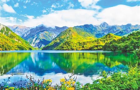 湖邊骨麻山巍峨聳立,湖水清澈澄碧,周?chē)置?,草甸如茵。夏季漫山遍野的高山杜鵑競(jìng)相怒放,形成高山、湖泊、森林、花海交織的美麗畫(huà)卷。