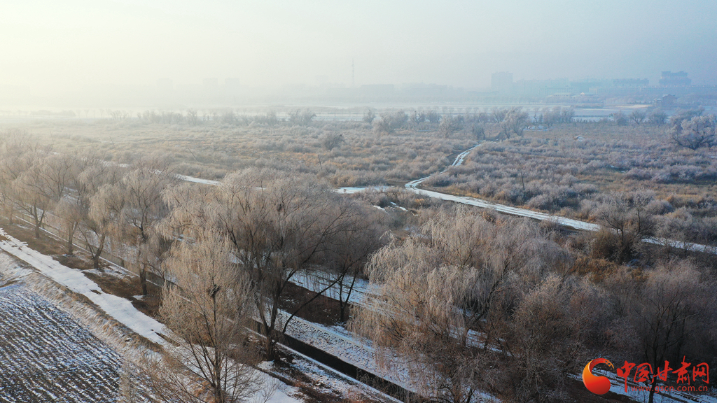 張掖市高臺(tái)縣黑河國家城市濕地公園的霧凇景觀。