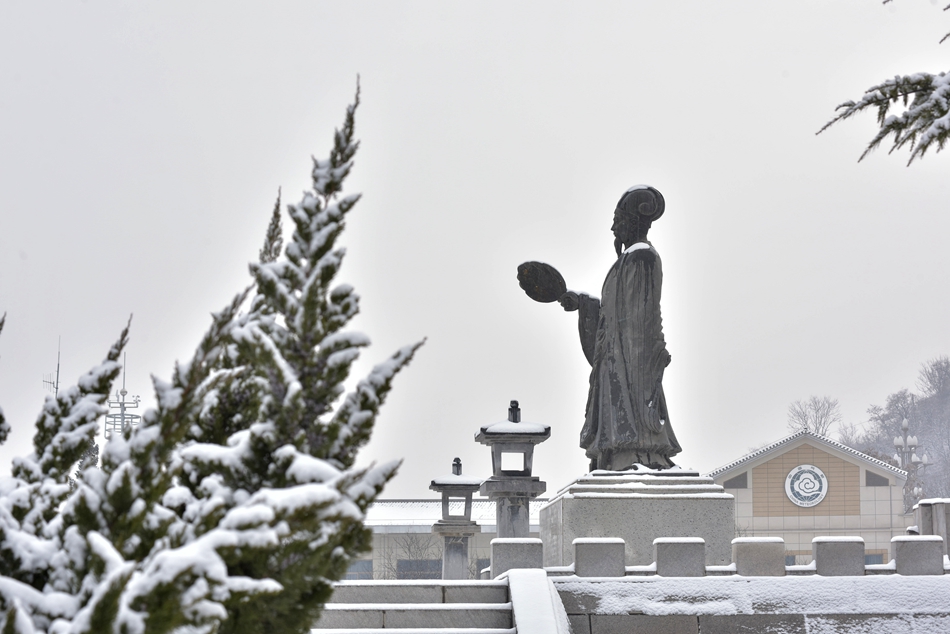 群峰環(huán)列,渭水在南北兩山間由西向東流過,形成一幅天然的太極圖。雪中透出大地色的樸拙,給予山川大地最初的模樣,層層繞繞的山路,修葺出渾然天成的萬物法則,也訴說著亙古不變的始祖智慧之起源。