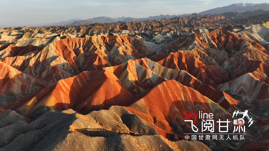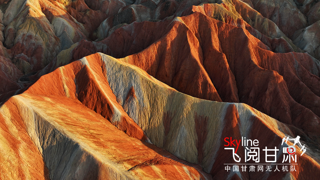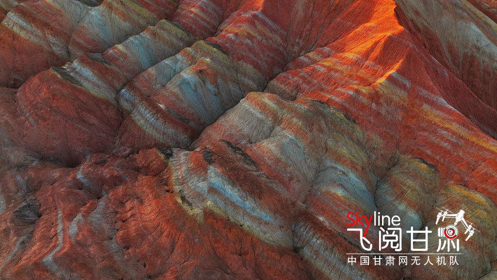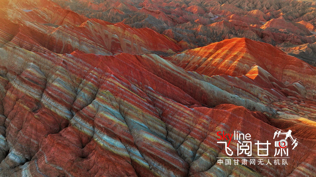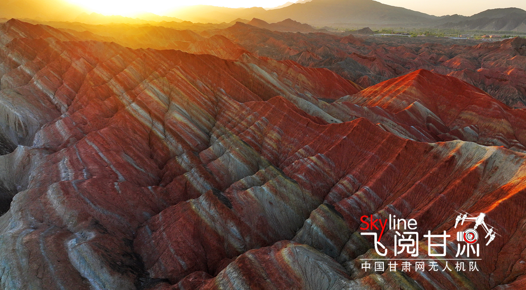 5月4日,落日余暉下的張掖七彩丹霞如同上帝打翻的調(diào)色盤,紅色、黃色、白色、綠藍(lán)色相間的山丘在陽(yáng)光的照射下,像披上了一層紅色輕紗,熠熠泛光,色彩艷麗,堪稱大自然的涂鴉神功。