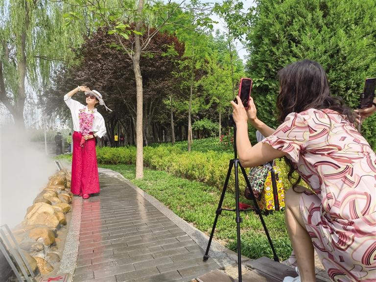 “一枝獨秀”團隊的王大姐和姐妹們帶著專屬攝影師正在這里攝影留念。王大姐告訴記者,這是她們今年第2次來這里打卡。“這里的花真美,每年我們都會來,拍照發(fā)在網(wǎng)上,收獲無數(shù)點贊,心情別提多美了。”說話間,姐妹們又?jǐn)[了幾個造型,攝影師按下快門,精準(zhǔn)捕捉唯美瞬間。“4公里外的寓言故事園最近也特別火,過兩天我們就去打卡。”王大姐說。