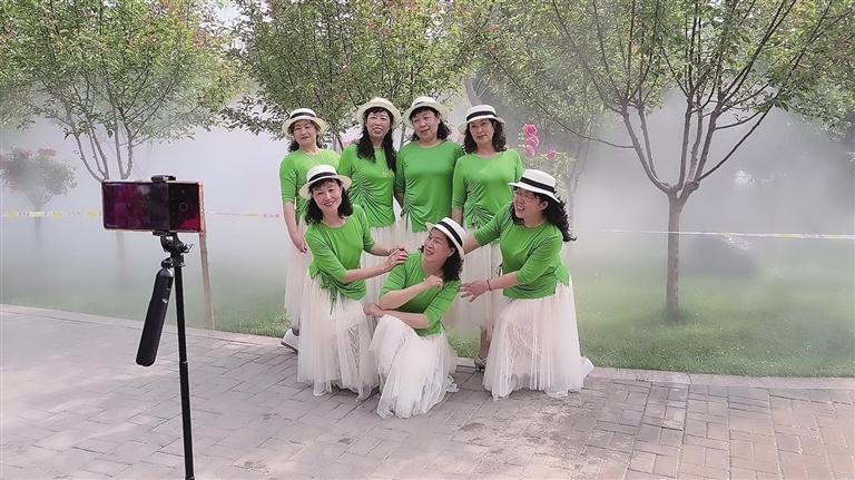 上午9時30分,水池中漸漸漫出淡淡的煙霧,時而稀薄,時而濃厚,隨著陣陣微風(fēng)飄蕩在小橋流水間。“準(zhǔn)備放音樂,我在原地來回轉(zhuǎn),你用手機豎屏拍。”……記者穿梭于人群間,這樣的聲音不絕于耳。“姐妹花”龔大姐和田大姐身穿正裝,各自圍上了顏色艷麗的圍巾,正站在鏡頭前直播。“這里非常美,像仙境一樣。綠化也做得特別好,公園里的綠植和鮮花種類繁多,很好看。我們是第一次來,希望蘭州多打造一些這樣的美景。”