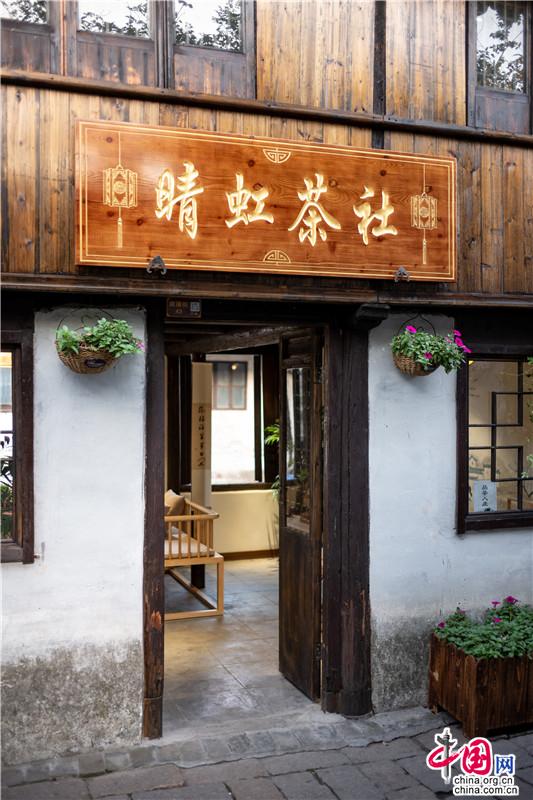 一杯清茶慰秋涼。一半清香,一半醉。湖光軟漾,目光游弋,步子跟著流水緩了下來,斜身隱入街角的茶樓,點上一杯“阿婆茶”,這是周莊入秋的儀式。古樸氣韻、木香纏繞,聲色之間,抿一口茶香,身與心皆泡在這杯江南意境里。正如館名“晴虹茶社”,一杯茶歇,如晴日彩虹,拂開心中塵霧,只見晴天與好事。聚賓樓里阿婆茶香就著聲聲悠揚,時間氤氳成過眼云煙。